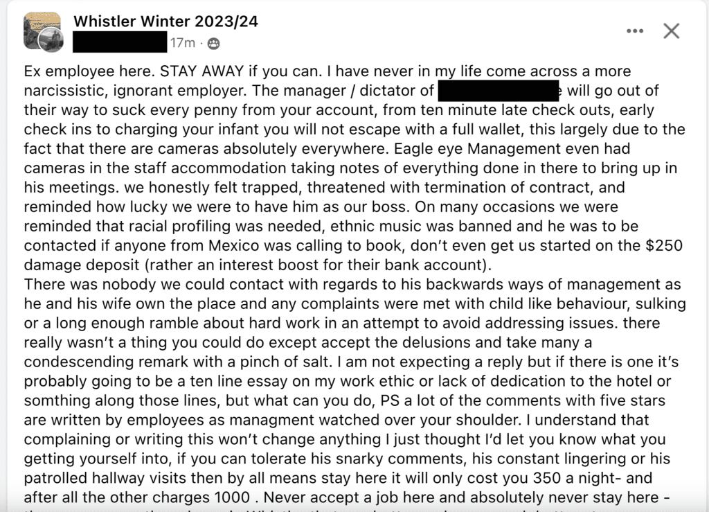 There’s also consequences when employees have a really bad experience. This is one hell of a hand-grenade thrown by a disgruntled employee on the town’s community Facebook group